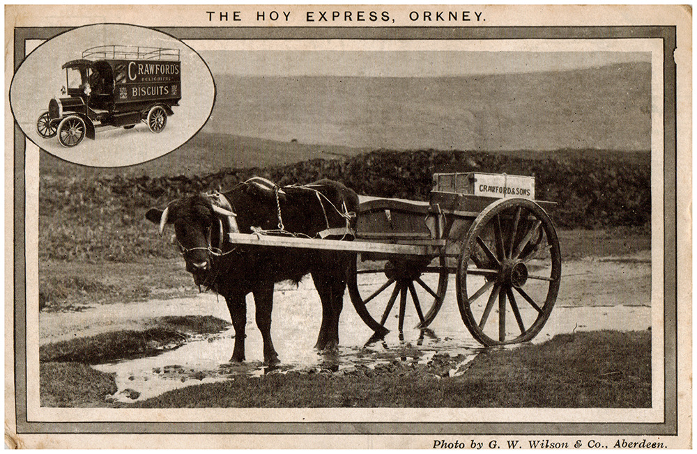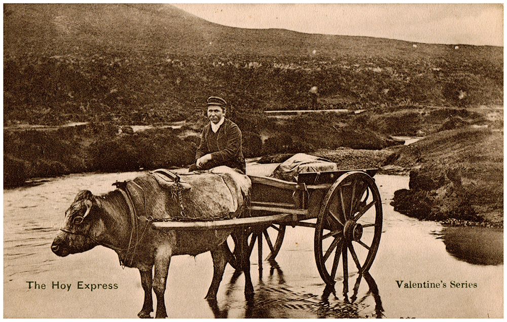 This path was the only connecting route between the township of Rackwick and the other communities in Hoy parish. The peat track can be wet and rough and was the only vehicle that could handle the terrain was a bullock drawn mail cart called The Hoy Express. This unusual transportation captured the Edwardian imagination and became a popular postcard subject. Find out more here.