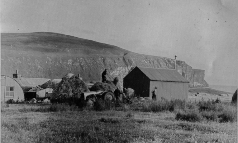 This corrugated iron shed was the shop in Rackwick, run by TH Rendall of The Glen. The shop was painted red and had windows at the front. On top of the oatstack is Jack Rendall and the lady is possibly Elizabeth Gerrie a visitor from Stromness. The Glen can be seen in the background with its nissen hut still there.