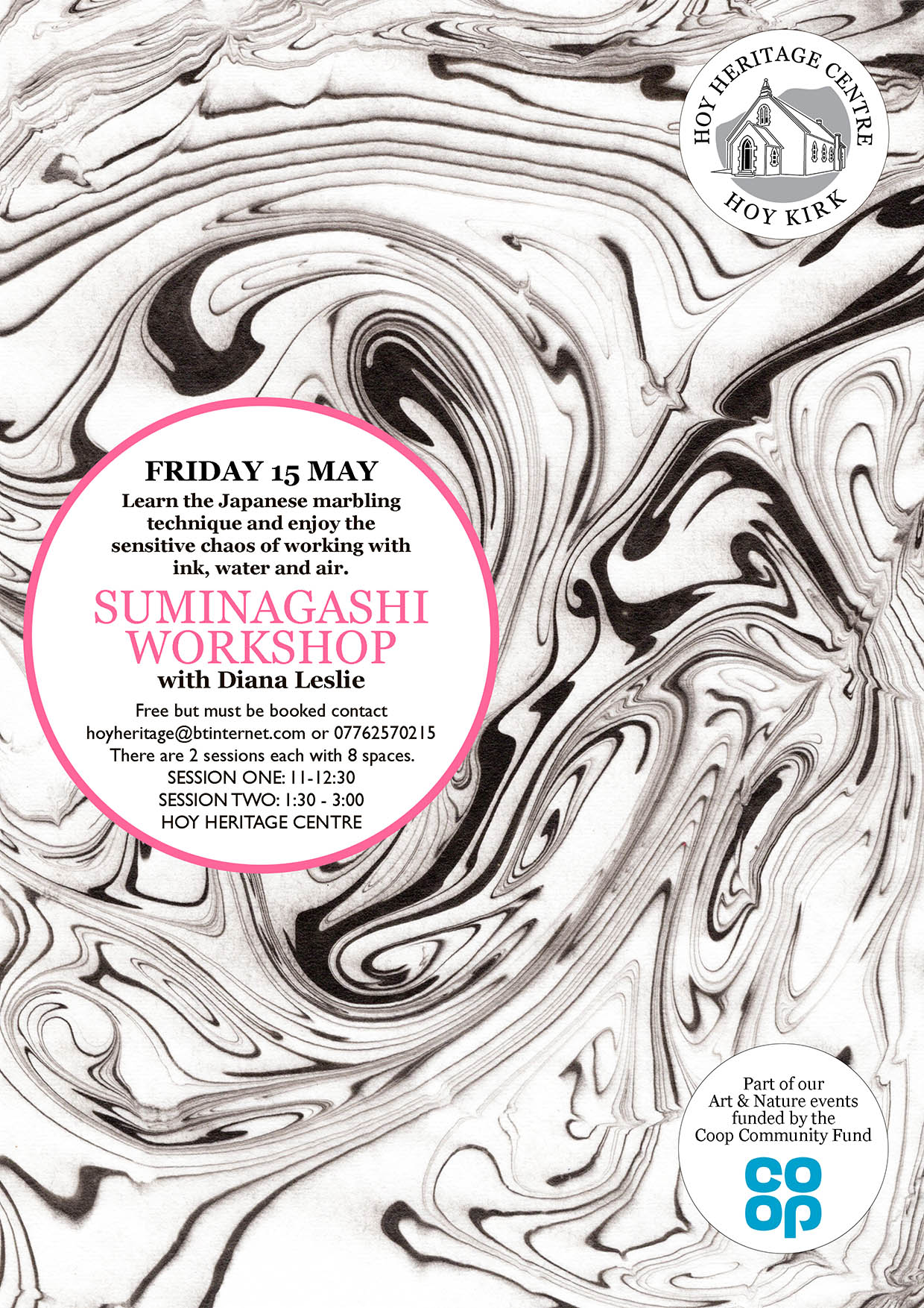 We are delighted to announce the the Coop Community Fund is supporting a series of Art & Nature events this year and the first one is on FRIDAY 15 MAY for a Suminagashi workshop with Diana Leslie. There are 2 free sessions 11am-12:30 and 1:30-3pm. Limited places for each session so book by contacting us here.