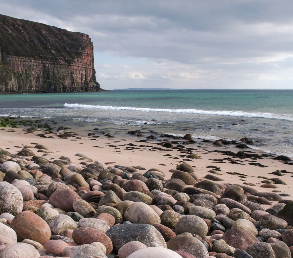 Rackwick beach has a wide sweep of pink sands and huge sea smoothed boulders that arrange themselves in size along the shore.