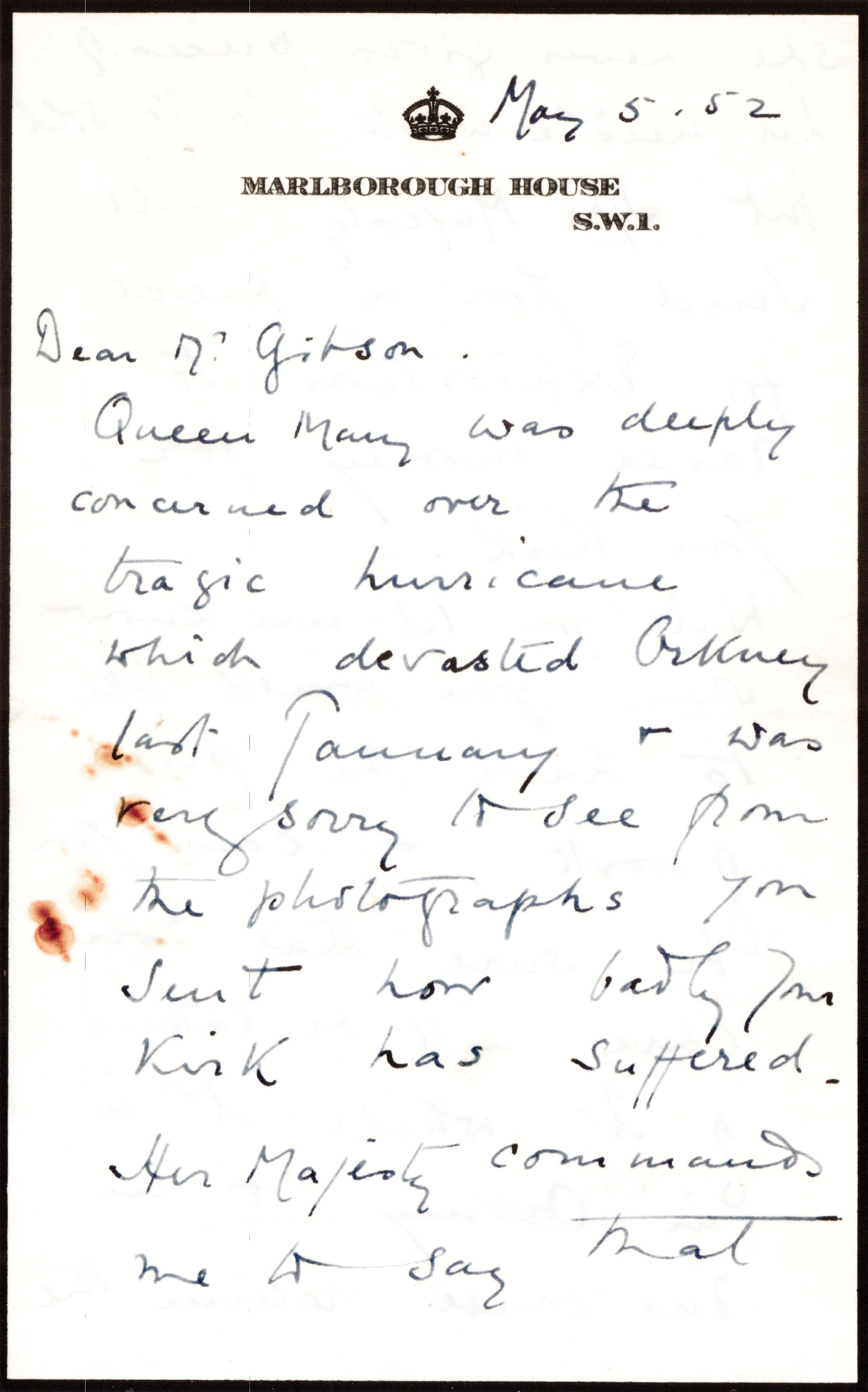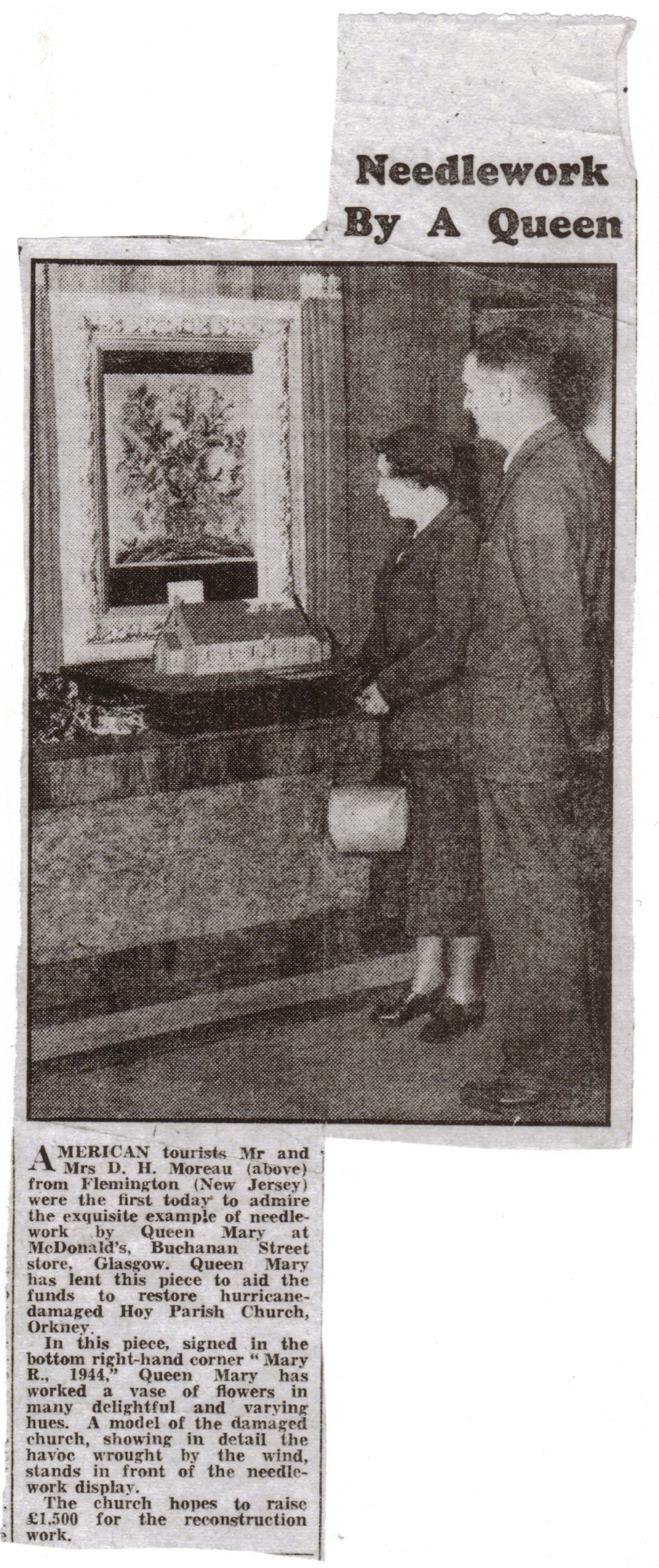 The Hoy Kirk was badly damaged by storms in January 1952. Queen Mary lent a needlework she had embroidered for a tour around Scotland to raise funds to restore the kirk. Letters and newspaper clippings can be found in the archive recording this piece of Hoy Kirk Royal History.