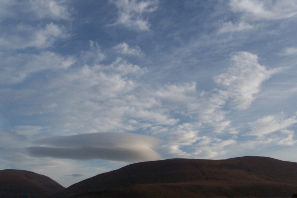 These clouds have the shape of a lens or almond, often very elongated and usually with well defined outlines. They occasionally show iridescence and often form above mountains. They are usually an indication of strong high atmospheric winds.