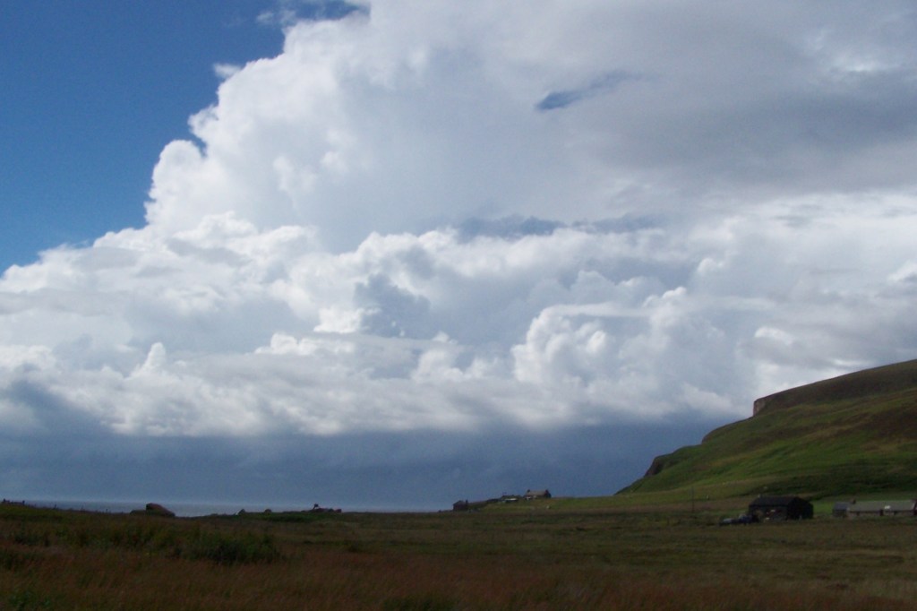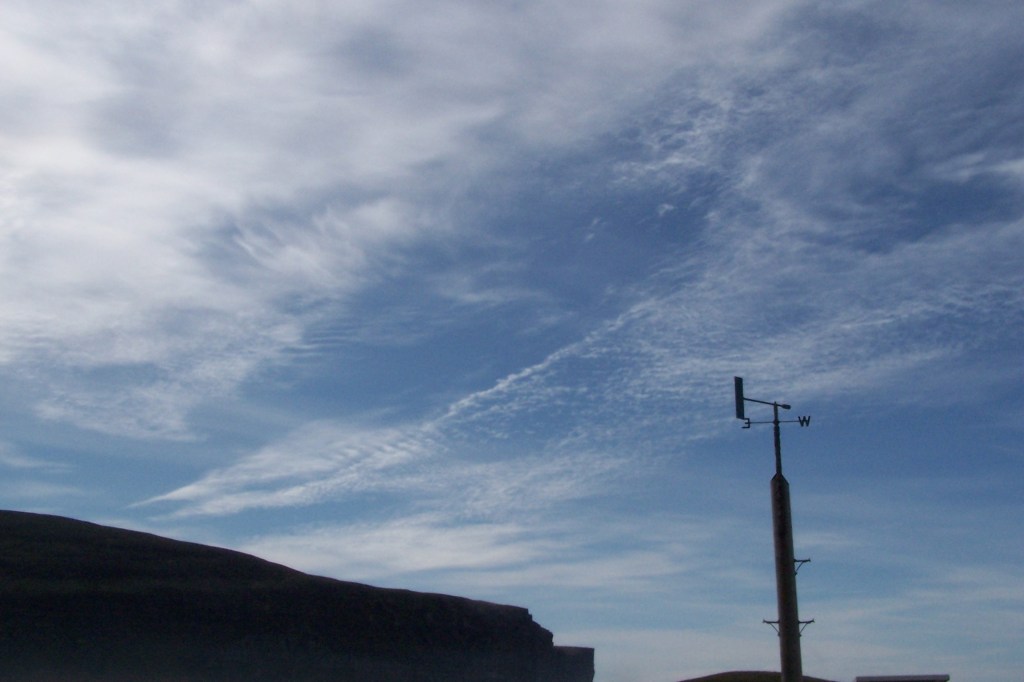 These clouds resemble pale cirrus or lenticular altocumulus and show very marked irisation, the most brilliant colours ocurring when the sun is just below the horizon. They are sometimes called Mother of Pearl clouds. These are rare clouds, in the 30 years I have been making observations in Rackwick, I have only seen this cloud twice. They have been observed mainly from Norway and Scotland at altitudes of 15 miles above the earth. ‘There is a dark side to these clouds, their chemical composition assists the production of chlorine atoms, which in turn contributes to the depletion of the ozone layer, so sadly, these most beautiful and benign looking clouds turn out to have a powerfully destructive environmental impact (Richard Hamblyn, Cloud Book)’.