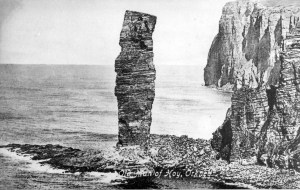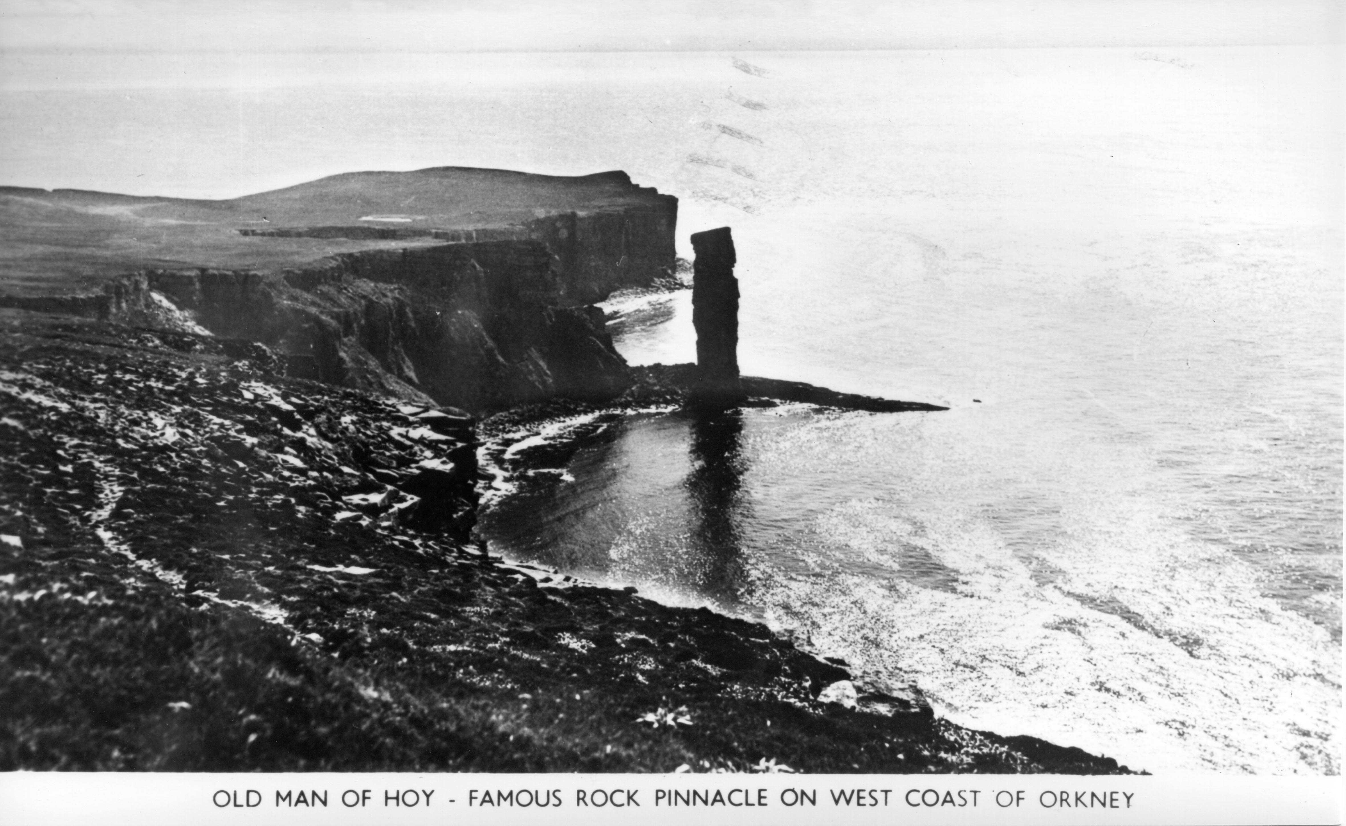 The Old Man is an iconic image of Orkney. Arguably the Ring o Brodgar has taken his place, but for many he is still the face of Orkney, a symbol for the island. We have a collection here of over fifty postcards of the Old Man dating from Victorian times to the present. He is visited frequently over the summer months and waved at from the Hamnavoe by thousands. Still his fame is relatively recent. He does not feature in earlier travel journals, but he was paid a visit in 1814 by the famous writer Sir Walter Scott.