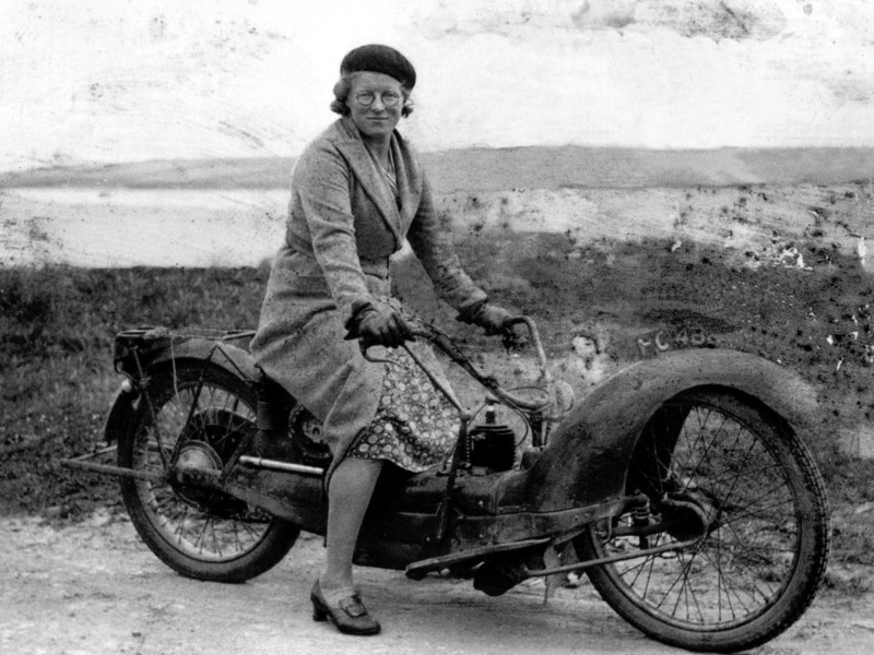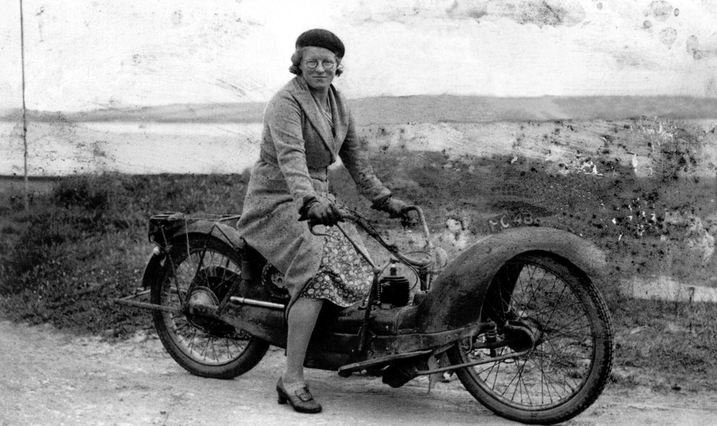 Cathy Wilson on her motorbike – Maureen Kinsey has identified it as a 1920s NER-A-CAR (nearly a car). One sold at Bonhams in 2017 for over £14,000!