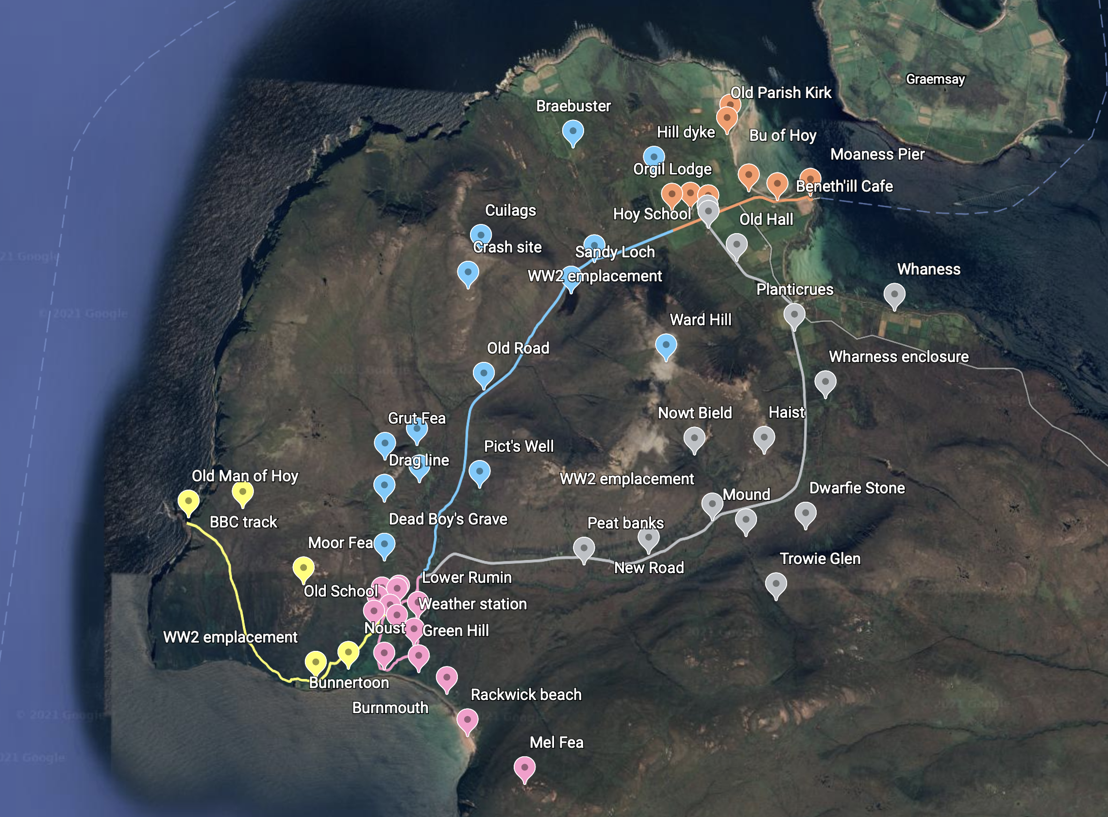 Join the Hoy community as they take you on a circular trip around the parish. Over thirty voices, some archive recordings and many new, will accompany you as you hear about Hoy, its people and places. Explore the archaeology, folklore, flora and fauna of the area in this immersive tour of a remarkable island parish.
