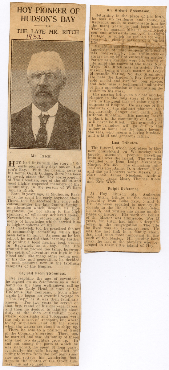 Hoy had links with the story of the early pioneering days out on Hudsons Bay. With the passing away at his home, Orgil Cottage, there has been removed, states the Hoy correspondent of The Orcadian, one of the oldest and most highly respected members of that community, in the person of William Sinclair Ritch.